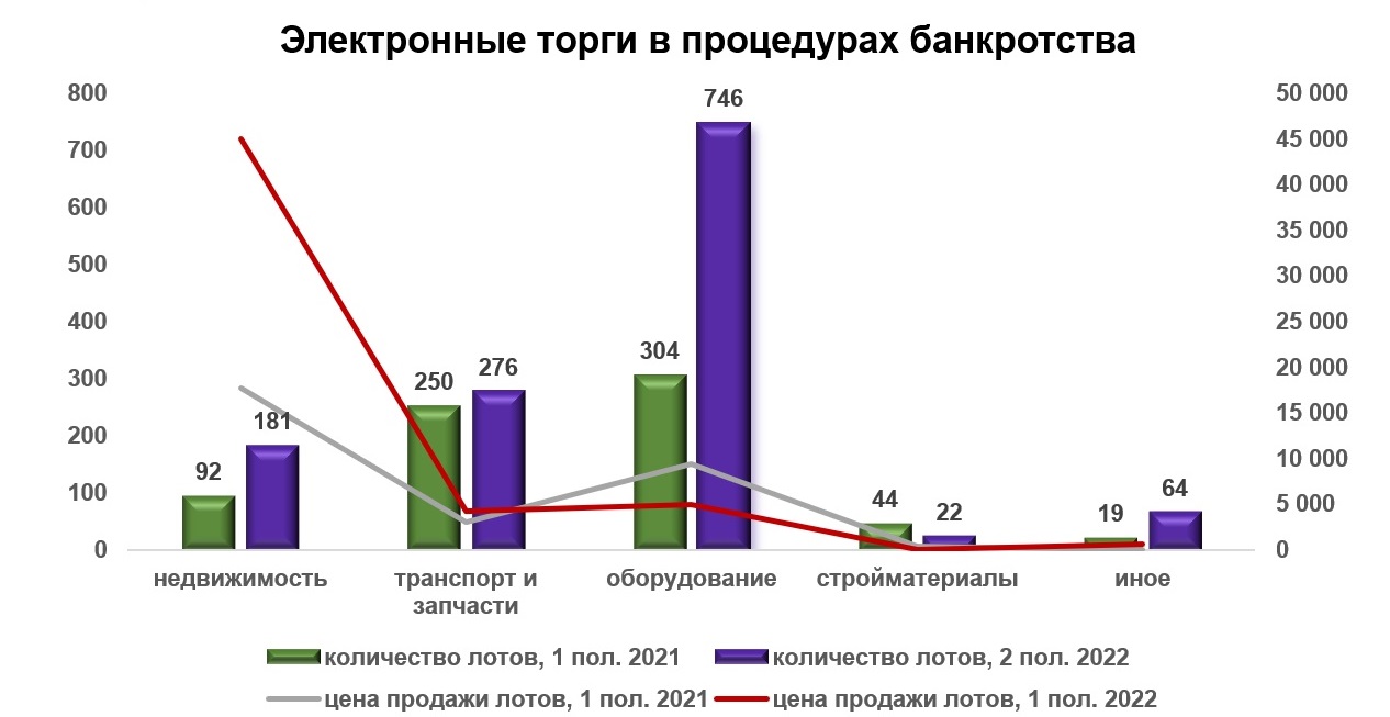За первое полугодие 2022 года на электронных торговых площадках реализовано имущество субъектов хозяйствования, находящихся в процедурах банкротства, на общую сумму 54,9 млн. рублей (по данным РУП «Информационный центр Министерства экономики Республики Беларусь», оператора ГИР «Единый государственный реестр сведений о банкротстве» www.bankrot.gov.by).