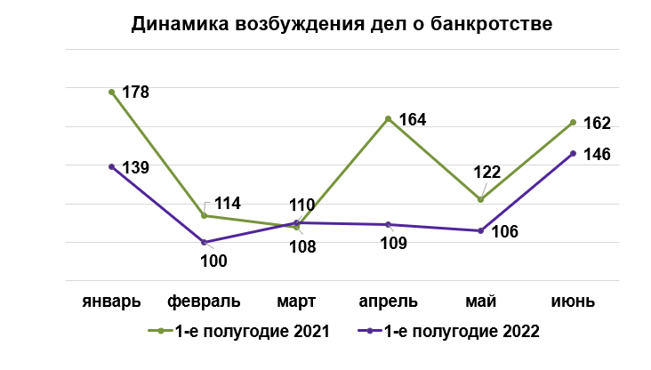 Продолжается динамика снижения количества дел о банкротстве, возбуждаемых экономическими судами. Так, в первом полугодии 2022 года в отношении 710 юридических лиц и индивидуальных предпринимателей возбуждено производство по делу об экономической несостоятельности (банкротстве), что на 16,3 % меньше аналогичного периода прошлого года (848 дел).