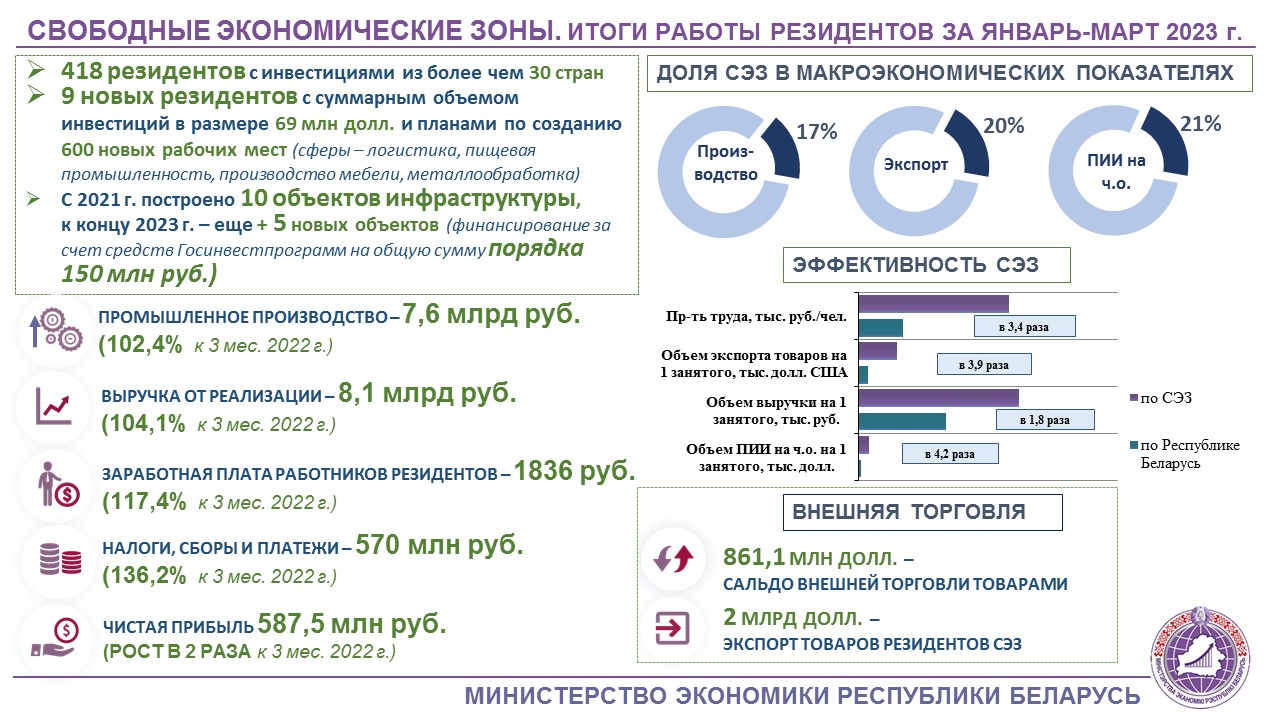 В первом квартале 2023 г. на долю резидентов свободных экономических зон пришлась пятая часть от общего объема экспорта товаров и привлеченных в страну прямых иностранных инвестиций на чистой основе, а также 17% производства промышленной продукции.