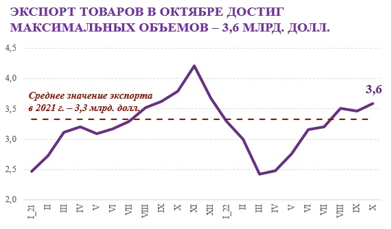Кроме того, его октябрьские объемы достигли рекордных в текущем году 3,6 млрд. долларов, что выше среднего значения экспорта 2021 года – одного из самых успешных с точки зрения внешней торговли.